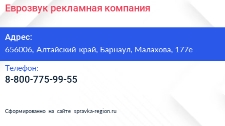 Еврозвук, рекламная компания по адресу 656006, Алтайский край, Барнаул, Малахова, 177е в дальнейшем Организация, размещена в следующих категориях: