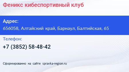 Феникс, кибеспортивный клуб по адресу 656058, Алтайский край, Барнаул, Балтийская, 65 в дальнейшем Организация, размещена в следующих категориях: