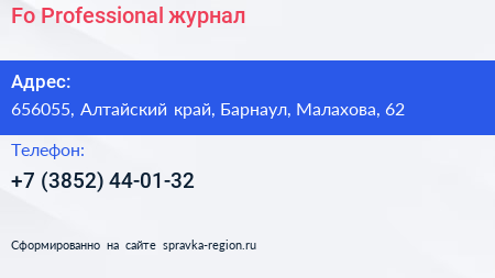 Fo Professional, журнал по адресу 656055, Алтайский край, Барнаул, Малахова, 62 в дальнейшем Организация, размещена в следующих категориях: