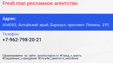 Fresh man, рекламное агентство по адресу 656010, Алтайский край, Барнаул, проспект Ленина, 195 в дальнейшем Организация, размещена в следующих категориях: