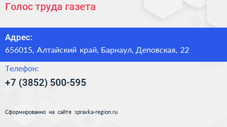 Голос труда, газета по адресу 656015, Алтайский край, Барнаул, Деповская, 22 в дальнейшем Организация, размещена в следующих категориях: