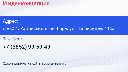 И идеиконцепции по адресу 656031, Алтайский край, Барнаул, Папанинцев, 116а в дальнейшем Организация, размещена в следующих категориях: