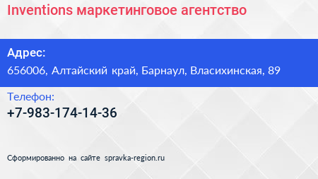 Inventions, маркетинговое агентство по адресу 656006, Алтайский край, Барнаул, Власихинская, 89 в дальнейшем Организация, размещена в следующих категориях: