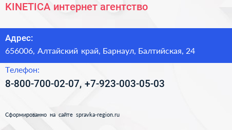 KINETICA, интернет-агентство по адресу 656006, Алтайский край, Барнаул, Балтийская, 24 в дальнейшем Организация, размещена в следующих категориях: