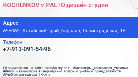 KOCHENKOV v PALTO, дизайн студия по адресу 656065, Алтайский край, Барнаул, Ленинградская, 16 в дальнейшем Организация, размещена в следующих категориях: