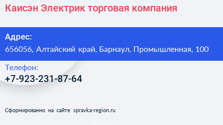Каисэн Электрик, торговая компания по адресу 656056, Алтайский край, Барнаул, Промышленная, 100 в дальнейшем Организация, размещена в следующих категориях: