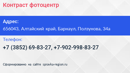 Контраст, фотоцентр по адресу 656043, Алтайский край, Барнаул, Ползунова, 34а в дальнейшем Организация, размещена в следующих категориях: