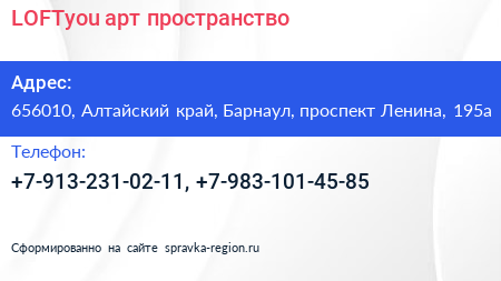 LOFTyou, арт-пространство по адресу 656010, Алтайский край, Барнаул, проспект Ленина, 195а в дальнейшем Организация, размещена в следующих категориях: