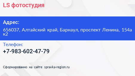 LS, фотостудия по адресу 656037, Алтайский край, Барнаул, проспект Ленина, 154а к2 в дальнейшем Организация, размещена в следующих категориях: