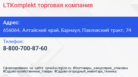 LTKomplekt, торговая компания по адресу 656064, Алтайский край, Барнаул, Павловский тракт, 74 в дальнейшем Организация, размещена в следующих категориях:
