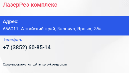 ЛазерРез комплекс по адресу 656011, Алтайский край, Барнаул, Ярных, 35а в дальнейшем Организация, размещена в следующих категориях: