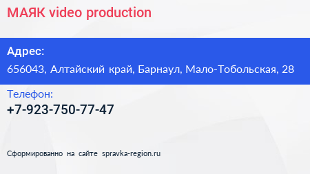 МАЯК video production по адресу 656043, Алтайский край, Барнаул, Мало-Тобольская, 28 в дальнейшем Организация, размещена в следующих категориях: