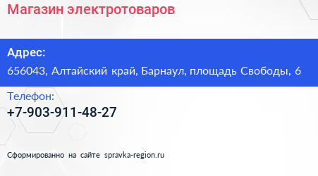 Магазин электротоваров по адресу 656043, Алтайский край, Барнаул, площадь Свободы, 6 в дальнейшем Организация, размещена в следующих категориях: