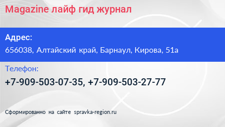 Magazine лайф-гид, журнал по адресу 656038, Алтайский край, Барнаул, Кирова, 51а в дальнейшем Организация, размещена в следующих категориях: