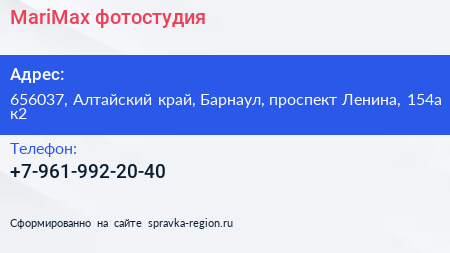 MariMax, фотостудия по адресу 656037, Алтайский край, Барнаул, проспект Ленина, 154а к2 в дальнейшем Организация, размещена в следующих категориях: