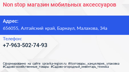 Non stop, магазин мобильных аксессуаров по адресу 656055, Алтайский край, Барнаул, Малахова, 34а в дальнейшем Организация, размещена в следующих категориях: