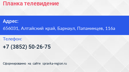 Планка, телевидение по адресу 656031, Алтайский край, Барнаул, Папанинцев, 116а в дальнейшем Организация, размещена в следующих категориях: