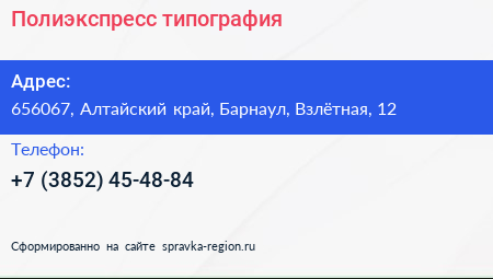 Полиэкспресс, типография по адресу 656067, Алтайский край, Барнаул, Взлётная, 12 в дальнейшем Организация, размещена в следующих категориях: