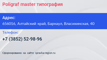 Poligraf-master, типография по адресу 656016, Алтайский край, Барнаул, Власихинская, 40 в дальнейшем Организация, размещена в следующих категориях: