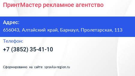 ПринтМастер, рекламное агентство по адресу 656043, Алтайский край, Барнаул, Пролетарская, 113 в дальнейшем Организация, размещена в следующих категориях: