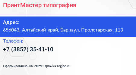 ПринтМастер, типография по адресу 656043, Алтайский край, Барнаул, Пролетарская, 113 в дальнейшем Организация, размещена в следующих категориях: