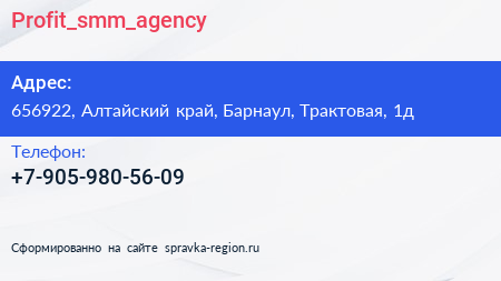 Profit_smm_agency по адресу 656922, Алтайский край, Барнаул, Трактовая, 1д в дальнейшем Организация, размещена в следующих категориях: