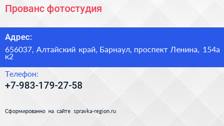 Прованс, фотостудия по адресу 656037, Алтайский край, Барнаул, проспект Ленина, 154а к2 в дальнейшем Организация, размещена в следующих категориях: