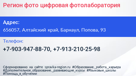 Регион фото, цифровая фотолаборатория по адресу 656057, Алтайский край, Барнаул, Попова, 93 в дальнейшем Организация, размещена в следующих категориях: