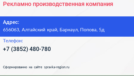 Рекламно-производственная компания по адресу 656063, Алтайский край, Барнаул, Попова, 5д в дальнейшем Организация, размещена в следующих категориях: