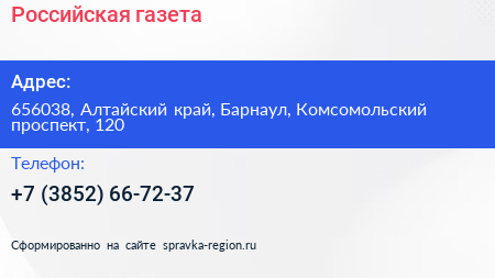Российская газета по адресу 656038, Алтайский край, Барнаул, Комсомольский проспект, 120 в дальнейшем Организация, размещена в следующих категориях: