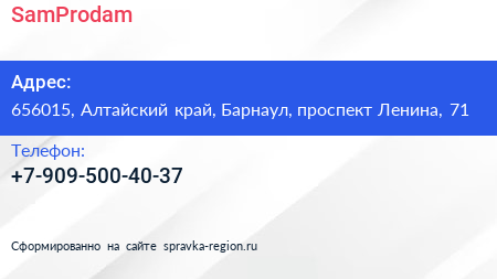SamProdam по адресу 656015, Алтайский край, Барнаул, проспект Ленина, 71 в дальнейшем Организация, размещена в следующих категориях: