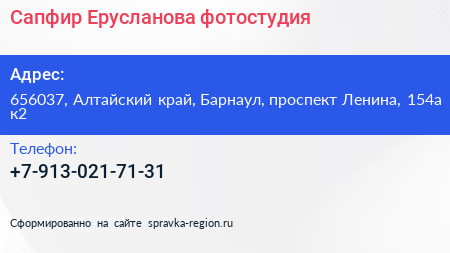 Сапфир-Ерусланова, фотостудия по адресу 656037, Алтайский край, Барнаул, проспект Ленина, 154а к2 в дальнейшем Организация, размещена в следующих категориях:
