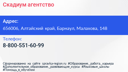 Скадиум, агентство по адресу 656006, Алтайский край, Барнаул, Малахова, 148 в дальнейшем Организация, размещена в следующих категориях: