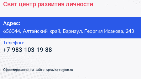 Свет, центр развития личности по адресу 656044, Алтайский край, Барнаул, Георгия Исакова, 243 в дальнейшем Организация, размещена в следующих категориях: