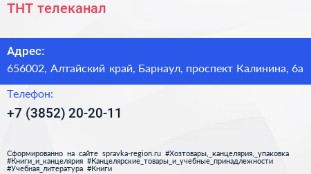 ТНТ, телеканал по адресу 656002, Алтайский край, Барнаул, проспект Калинина, 6а в дальнейшем Организация, размещена в следующих категориях: