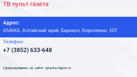 ТВ пульт, газета по адресу 656043, Алтайский край, Барнаул, Короленко, 107 в дальнейшем Организация, размещена в следующих категориях: