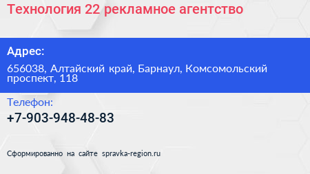 Технология-22, рекламное агентство по адресу 656038, Алтайский край, Барнаул, Комсомольский проспект, 118 в дальнейшем Организация, размещена в следующих категориях: