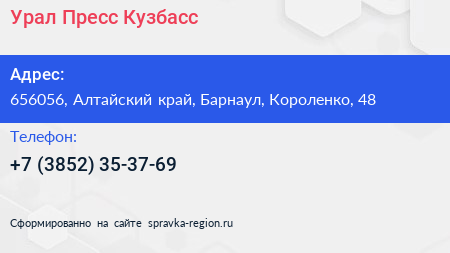 Урал-Пресс Кузбасс по адресу 656056, Алтайский край, Барнаул, Короленко, 48 в дальнейшем Организация, размещена в следующих категориях: