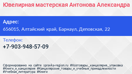 Ювелирная мастерская Антонова Александра по адресу 656015, Алтайский край, Барнаул, Деповская, 22 в дальнейшем Организация, размещена в следующих категориях: