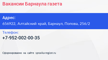 Вакансии Барнаула, газета по адресу 656922, Алтайский край, Барнаул, Попова, 256/2 в дальнейшем Организация, размещена в следующих категориях: