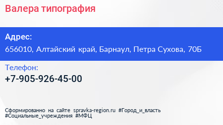 Валера, типография по адресу 656010, Алтайский край, Барнаул, Петра Сухова, 70Б в дальнейшем Организация, размещена в следующих категориях:
