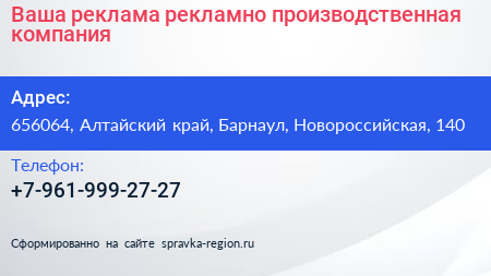 Ваша реклама, рекламно-производственная компания по адресу 656064, Алтайский край, Барнаул, Новороссийская, 140 в дальнейшем Организация, размещена в следующих категориях: