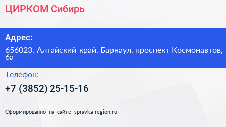 ЦИРКОМ Сибирь по адресу 656023, Алтайский край, Барнаул, проспект Космонавтов, 6а в дальнейшем Организация, размещена в следующих категориях: