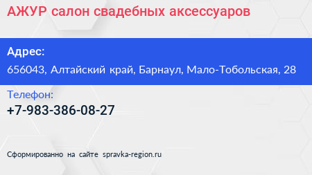 АЖУР, салон свадебных аксессуаров по адресу 656043, Алтайский край, Барнаул, Мало-Тобольская, 28 в дальнейшем Организация, размещена в следующих категориях: