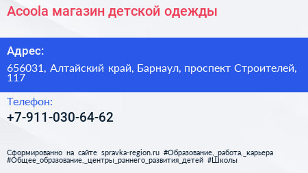 Acoola, магазин детской одежды по адресу 656031, Алтайский край, Барнаул, проспект Строителей, 117 в дальнейшем Организация, размещена в следующих категориях: