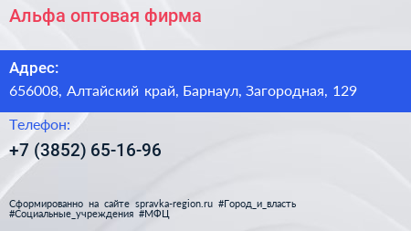 Альфа, оптовая фирма по адресу 656008, Алтайский край, Барнаул, Загородная, 129 в дальнейшем Организация, размещена в следующих категориях: