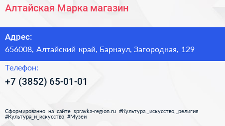 Алтайская Марка, магазин по адресу 656008, Алтайский край, Барнаул, Загородная, 129 в дальнейшем Организация, размещена в следующих категориях: