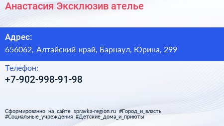 Анастасия-Эксклюзив, ателье по адресу 656062, Алтайский край, Барнаул, Юрина, 299 в дальнейшем Организация, размещена в следующих категориях: