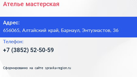 Ателье-мастерская по адресу 656065, Алтайский край, Барнаул, Энтузиастов, 36 в дальнейшем Организация, размещена в следующих категориях: