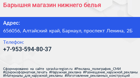 Барышня, магазин нижнего белья по адресу 656056, Алтайский край, Барнаул, проспект Ленина, 2Б в дальнейшем Организация, размещена в следующих категориях: